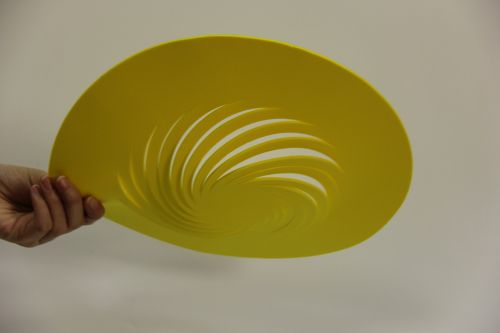最終生產(chǎn)出的帽子,主體為明亮的黃色 EVA 泡棉,螺旋狀的鏤空內(nèi)襯結(jié)構(gòu)清晰可見,造型獨(dú)特且富有層次感。從不同角度觀察,帽子既有著圓潤的輪廓,又因鏤空呈現(xiàn)出靈動的視覺效果,整體新穎、活潑,兼具創(chuàng)意與實(shí)用性。投入市場后,這款帽子憑借其獨(dú)特的設(shè)計(jì)和 EVA 泡棉內(nèi)襯帶來的良好質(zhì)感,受到了消費(fèi)者的廣泛關(guān)注與喜愛,為客戶的品牌推廣起到了積極的作用,也成為了該創(chuàng)意設(shè)計(jì)公司的一款明星產(chǎn)品。